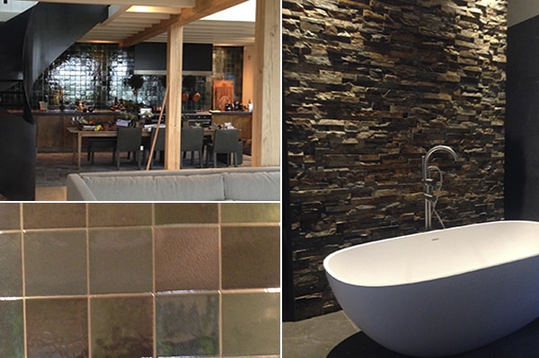 Hierboven een overzichtje van onze laatste projecten in 2016. Inrichting van een woonkeuken met een zgn. gesmoorde, handvorm tegelwand in groen/brons en een stijlvollle badkamer met een bad van JEE-O en een achterwand van ruwe brick-stones.